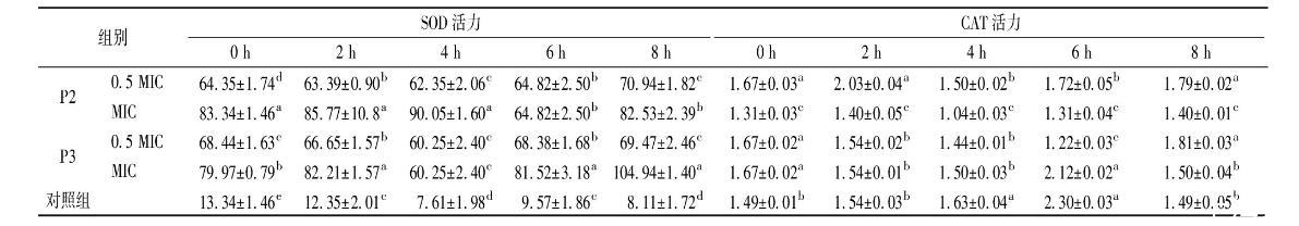SOD和CAT對(duì)細(xì)菌細(xì)胞內(nèi)抗氧化系統(tǒng)起著重要的防御作用。由表2可以看出,0~8 h內(nèi)加入MIC和0.5 MIC的P2和P3后SOD活力顯著高于對(duì)照組(P<0.05),說(shuō)明P2和P3能夠大幅度提高腐生葡萄球菌胞內(nèi)SOD活力,從而影響菌體正常生長(zhǎng)代謝;添加MIC的P2和P3比添加0.5 MIC的P2和P3的SOD活力提升得更高,說(shuō)明P2和P3對(duì)腐生葡萄球菌SOD活力影響具有濃度依賴(lài)性;2~8 h添加MIC的P2處理組CAT活力顯著低于對(duì)照組(P<0.05),添加MIC的P3在2~6 h內(nèi)CAT活力也低于對(duì)照組。由此可推測(cè),P2和P3可通過(guò)提升腐生葡萄球菌SOD活力和降低CAT活力來(lái)影響菌體正常生長(zhǎng)。黃偉英等采用試劑盒方法測(cè)定乳酸鏈球菌素對(duì)腐生葡萄球菌的抑菌機(jī)制,結(jié)果表面乳酸鏈球菌素可通過(guò)降低腐生葡萄球菌SOD和CAT活力使菌體抗氧化動(dòng)態(tài)失衡,導(dǎo)致菌體生長(zhǎng)受到抑制。