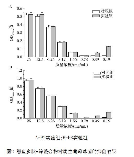 本研究以鱖魚(yú)肉為原料,經(jīng)風(fēng)味蛋白酶酶解制得水解物,之后與ZnSO4·7H2O螯合,再經(jīng)“離心-醇沉法”和“醇沉-離心法”制備出鱖魚(yú)多肽-鋅螯合物P1、P2和P3。探究P1、P2和P3的抑菌活性,抑菌圈實(shí)驗(yàn)結(jié)果顯示P2和P3對(duì)腐生葡萄球菌的抑菌效果更佳;P2和P3對(duì)腐生葡萄球菌的MIC均為0.78 mg/mL。腐生葡萄球菌的抑菌機(jī)制的解析為:P2和P3能夠增加細(xì)胞膜通透性、破壞細(xì)胞膜完整性、改變細(xì)菌結(jié)構(gòu)、提升細(xì)菌胞內(nèi)SOD活力和降低CAT活力,從而達(dá)到抑菌作用。其中,抑菌圈、紫外吸收和生物掃描電鏡實(shí)驗(yàn)結(jié)果顯示,P3的抑菌效果優(yōu)于P2,可能是P3=P1+P2的緣故,2種螯合物協(xié)同作用時(shí)能夠達(dá)到更好的抑菌效果。研究結(jié)果表明,鱖魚(yú)多肽-鋅螯合物可以作為抑制腐生葡萄球菌的備選劑之一,未來(lái)本團(tuán)隊(duì)將繼續(xù)研究鱖魚(yú)多肽-鋅螯合物促進(jìn)水產(chǎn)品保鮮的機(jī)理。