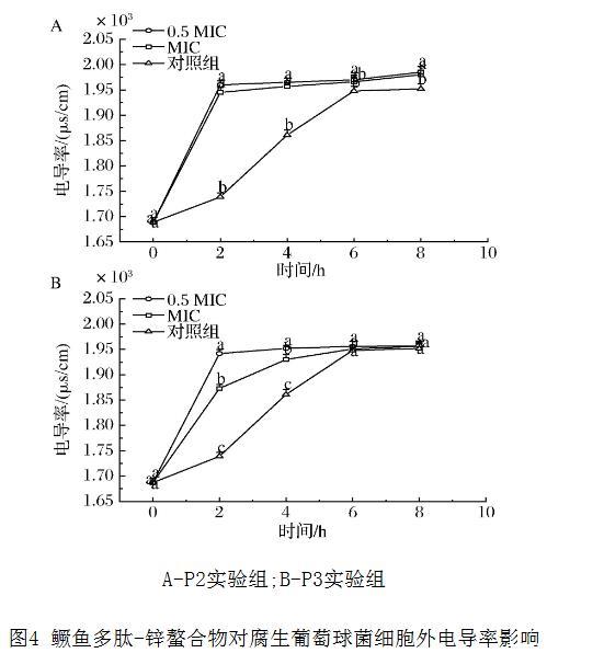 圖4鱖魚(yú)多肽-鋅螯合物對(duì)腐生葡萄球菌細(xì)胞外電導(dǎo)率影響
