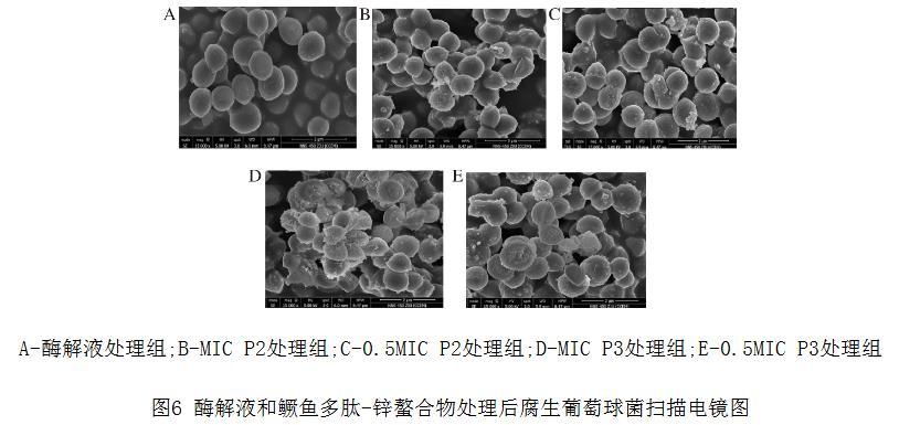 圖6酶解液和鱖魚(yú)多肽-鋅螯合物處理后腐生葡萄球菌掃描電鏡圖