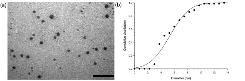 圖1、TEM圖像(Bar等于50 nm)(a)和油酸銀封端NP的直徑累積分布(b)。實心點為實驗數(shù)據(jù),連續(xù)線為高斯擬合。