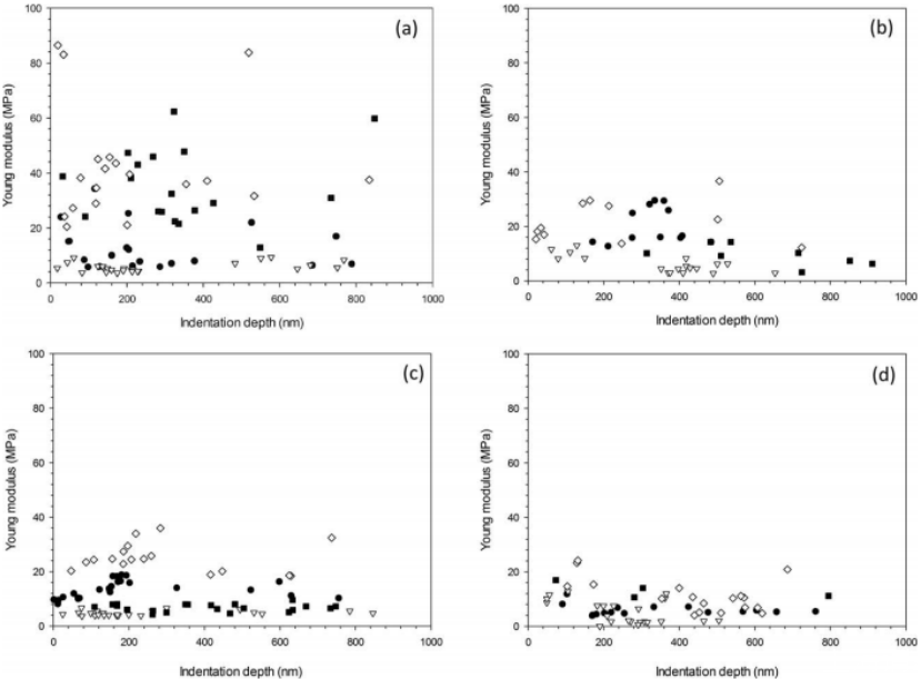 圖5、在PBS中浸泡0小時(a)、24小時(b)、2周(c)和4周(d)后,通過納米壓痕試驗測定含NP的骨水泥的楊氏模量。(●)0%、(▽)0.01%、(實心正方形)0.05%和(◇)0.1%。