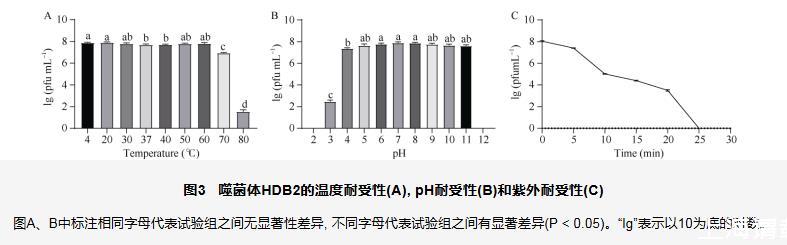 圖3噬菌體HDB2的溫度耐受性(A),pH耐受性(B)和紫外耐受性(C)
