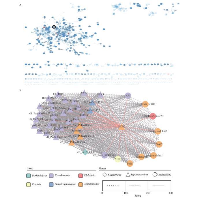 蛋白網(wǎng)絡(luò)圖由19,790個(gè)噬菌體(節(jié)點(diǎn))和911,802個(gè)關(guān)系(連接線)組成,圖A中黑色圓圈代表HDB2所在位置,圖B表示HDB2所在的蛋白簇,不同顏色的節(jié)點(diǎn)代表不同宿主的噬菌體,不同形狀代表不同的種屬。圖C中不同結(jié)點(diǎn)代表不同的種屬的噬菌體,線段長度對(duì)應(yīng)進(jìn)化距離。