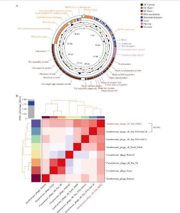 將噬菌體HDB2在NCBI進(jìn)行BLASTn比對(duì)發(fā)現(xiàn),HDB2基因組與Septimatrevirus屬噬菌體vB_ Xar_IVIA-DoCa8(ON932082.1)、vB_Xar_IVIA-DoCa1(NC_069745.1)及vB XooS NR08(OQ055246.1)核苷酸序列相似性較高,分別為97.93%、97.89%、97.55%,其覆蓋度分別為95%、96%、97%。平均核苷酸相似度(average nucleotideidentity,ANI)是在核苷酸水平上比較2個(gè)基因組親緣關(guān)系的指標(biāo)。ANIm熱圖不同顏色代表不同ANI數(shù)值,顏色越紅代表相似度越高。由圖4-B可知,HDB2與黃單胞菌噬菌體vB_Xar_IVIA-DoCa8的ANI值最高,為97.74%,初步推斷HDB2為Septimatrevirus屬噬菌體。