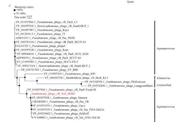 利用vConTACT2.0從蛋白質(zhì)水平研究噬菌體之間的親緣關(guān)系。選取Millardlab數(shù)據(jù)庫病毒序列合集進(jìn)行共享網(wǎng)絡(luò)分析。蛋白網(wǎng)絡(luò)圖每個(gè)節(jié)點(diǎn)代表一個(gè)病毒,節(jié)點(diǎn)之間的連線顯示了病毒簇之間的相關(guān)性,圖5-A黑色圓圈表示HDB2所在位置,圖5-B中不同形狀代表不同宿主的噬菌體,不同顏色代表不同的病毒集群。圖中共有19,790個(gè)節(jié)點(diǎn)和911,802條連線,代表了19,790個(gè)噬菌體之間的911,802個(gè)關(guān)系。HDB2位于VC7890病毒簇,與其中的42株噬菌體均具有強(qiáng)關(guān)聯(lián)性。HDB2與其中的vB_Xar_IVIA-DoCa8、vB_Xar_IVIA-DoCa11等32個(gè)噬菌體都被歸于同一個(gè)屬(Septimatrevirus)。有10個(gè)噬菌體暫未有明確分屬,剩下的1個(gè)噬菌體被劃分為Kilunavirus屬。通過系統(tǒng)發(fā)育樹進(jìn)一步了解HDB2與其他噬菌體的親緣關(guān)系。系統(tǒng)發(fā)育樹由結(jié)點(diǎn)(node)和進(jìn)化分支(branch)組成,每一結(jié)點(diǎn)代表一個(gè)分類單元,而結(jié)點(diǎn)之間的線段長度和角度可以反映物種間的進(jìn)化距離和時(shí)間,較長的線段表示物種間親緣關(guān)系較遠(yuǎn),而較短的線段表示物種間親緣關(guān)系較近。對(duì)HDB2的末端酶大亞基進(jìn)行BLASTp比對(duì)后,選取末端酶大亞基相似度較高的25株噬菌體構(gòu)建系統(tǒng)發(fā)育樹。由圖5-C可知,HDB2與黃單胞噬菌體Samson(YP_010597508.1)位于同一進(jìn)化分支,均屬于Septimatrevirus屬。綜上所述,HDB2屬于Septimatrevirus屬的成員。