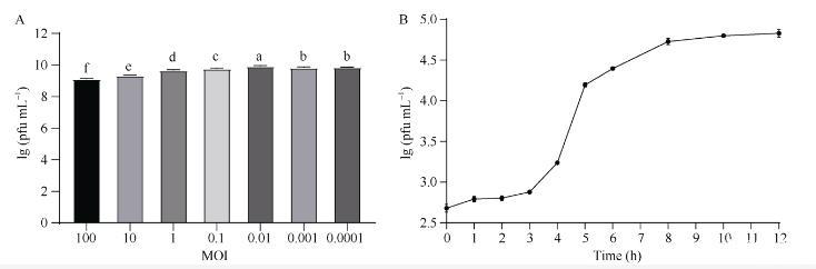 圖2噬菌體HDB2的最佳MOI(A)和一步生長曲線(B)