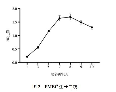 如圖2所示,PMEC生長曲線呈“S”型,培養(yǎng)1~3 d時處于潛伏期,細胞生長較為緩慢;培養(yǎng)3~5 d時為對數(shù)生長期,細胞增殖速度明顯提高;培養(yǎng)7~8 d后進入平臺期,細胞增殖速度大幅度降低。上述結(jié)果表明,本試驗條件下分離培養(yǎng)的PMEC生長狀態(tài)良好。
