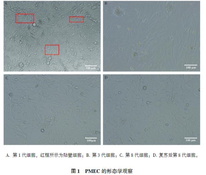 經(jīng)組合酶消化組織塊法分離PMEC,第1代細胞大小不等,種類較為雜亂,但能觀察到有部分細胞貼壁(圖1A);在培養(yǎng)第3代時PMEC與成纖維細胞混雜生長形態(tài)多為梭狀與多角形(圖1B);當(dāng)傳至第8代時,大部分成纖維細胞已被去除,保留了較純的PMEC,其形態(tài)多為鵝卵石狀,表現(xiàn)為單層、上皮樣形態(tài),形成單層聚集形島嶼(圖1C);重新復(fù)蘇后的PMEC生長狀態(tài)良好(圖1D)。