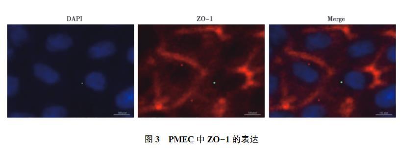 IFA結(jié)果可見,ZO-1抗體可與蛋白特異性結(jié)合,細胞與細胞之間出現(xiàn)了紅色熒光信號,表明PMEC之間形成良好的緊密連接(圖3)。