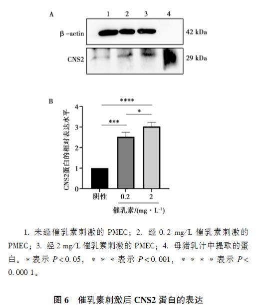Western blot檢測結(jié)果如圖6所示,未經(jīng)催乳素刺激的PMEC表達的CNS2較少,而催乳素刺激后PMEC表達的CNS2增多,且隨著催乳素濃度的增大CNS2表達增加(圖6A)。將催乳素刺激組與陰性對照組蛋白的內(nèi)參歸一化后灰度值統(tǒng)計結(jié)果顯示,催乳素刺激組與陰性對照組相比,CNS2蛋白表達極顯著增加,且隨著催乳素濃度的增加,該蛋白的表達也存在顯著的增加(圖6B)。