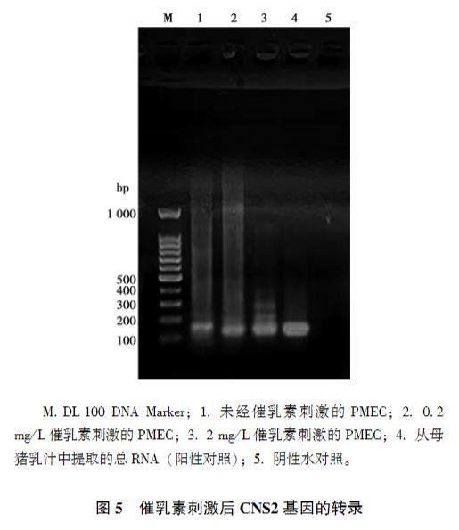 對PMEC標(biāo)志基因CNS2進行RT-PCR檢測,結(jié)果可見該細胞轉(zhuǎn)錄CNS2基因,且PMEC經(jīng)0.2 mg/L與2 mg/L的催乳素刺激后,CNS2基因的轉(zhuǎn)錄相比對照組均有升高的趨勢。(圖5)。
