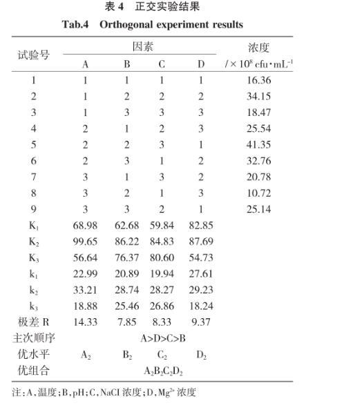 由表4可知,4個考察因素中,溫度對該菌生長影響最大,Mg2+濃度次之,pH影響最小,最優(yōu)組合是A2B2C2D2,即25℃、pH 6.5、2%的NaCl和2.5mg/L的Mg2+。