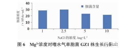 由圖6可知,不同濃度Mg2+對GZ1株生長影響差異顯著(P<0.05),Mg2+濃度為2.5 mg/L時,細菌濃度最高,為30.43×108cfu/mL,Mg2+濃度過高,細菌濃度反而降低,說明細菌濃度不隨Mg2+濃度高而增加。