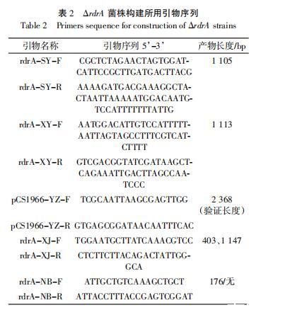 分別使用rdrA-SY-F/R、rdrA-XY-F/R引物擴(kuò)增F44基因組rdrA基因上下游各1000bp左右同源臂,以pCS1966質(zhì)粒為載體,使用BamHI和HindIII酶切位點(diǎn)連接至載體上。用同源重組雙交換原理敲除靶標(biāo)基因,通過(guò)含有5-氟乳清酸的合成培養(yǎng)基篩選得到rdrA缺失型菌株,使用rdrA-NB-F/R、rdrA-XJ-F/R引物進(jìn)行菌落PCR并進(jìn)行瓊脂糖凝膠電泳驗(yàn)證。設(shè)計(jì)引物如表2所示。