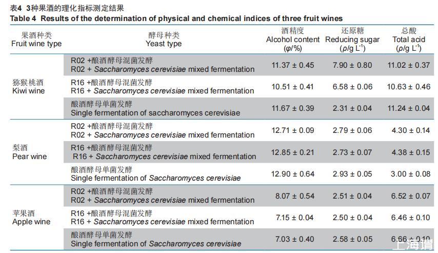 根據(jù)GB/T 15038-2006和《葡萄酒、果酒通用分析方法》,測(cè)定釀酒酵母單菌發(fā)酵、R02與釀酒酵母發(fā)酵、R16與釀酒酵母混菌發(fā)酵釀造的獼猴桃酒、梨酒、蘋(píng)果酒的理化指標(biāo),結(jié)果見(jiàn)表4。R02、R16混菌發(fā)酵的果酒,其酒精度、還原糖含量、總酸含量均能符合果酒釀造的生產(chǎn)需要。相對(duì)酵母單菌發(fā)酵,混菌發(fā)酵的獼猴桃酒的還原糖殘?zhí)秋@著提高,其他變化不明顯;混菌發(fā)酵的梨酒的總酸含量均顯著上升,還原糖殘?zhí)呛可燥@降低,酒精度變化不明顯;R02混菌發(fā)酵的蘋(píng)果酒的酒精度稍顯提高,其他變化不顯著。綜上,菌株R02和R16可作為果酒釀造的優(yōu)質(zhì)產(chǎn)香酵母,在果酒釀造的生產(chǎn)中具有較好的應(yīng)用前景。