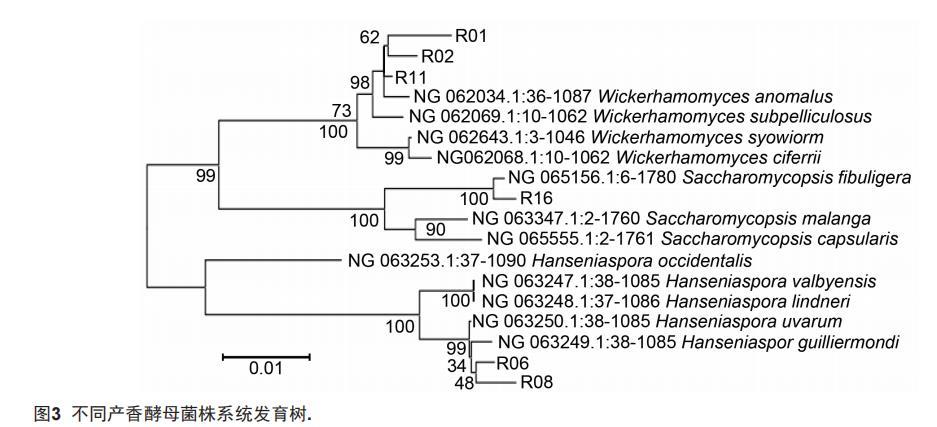本研究從新鮮的果皮、枝梗和大曲中共分離出16株具有典型酵母特征的菌株。經(jīng)嗅聞法初篩、總酯測(cè)定復(fù)篩和分子生物學(xué)鑒定為6株產(chǎn)香酵母,經(jīng)鑒定發(fā)現(xiàn)R01、R02、R11為異常威克漢姆酵母(Wickerhamomyces anomalus);R06、R08為季也蒙有孢漢遜酵母(Hanseniaspora guilliermondii);R16為扣囊復(fù)膜酵母(Saccharomycopsis fibuligera)。