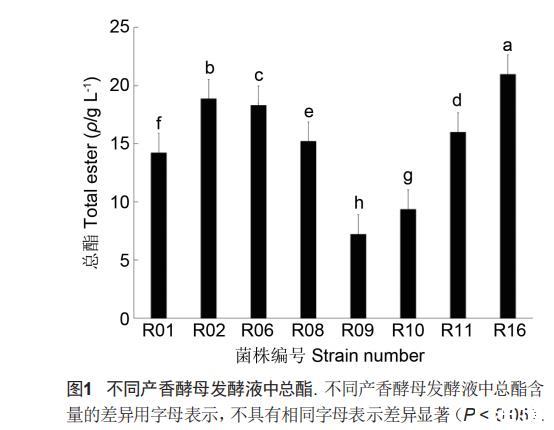 圖1 不同產(chǎn)香酵母發(fā)酵液中總酯。不同產(chǎn)香酵母發(fā)酵液中總酯含量的差異用字母表示,不具有相同字母表示差異顯著(P < 0.05)。