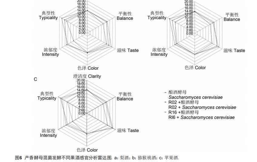 感官評(píng)價(jià)是評(píng)定果酒品質(zhì)的重要極指標(biāo),選擇R02、R16分別與釀酒酵母混菌發(fā)酵梨酒、獼猴桃酒、蘋(píng)果酒,對(duì)果酒的澄清度、典型性、滋味、平衡性、濃郁度和色澤6個(gè)方面進(jìn)行感官分析以及與釀酒酵母單菌發(fā)酵果酒進(jìn)行綜合對(duì)比,結(jié)果如圖6所示:在3種果酒中,R02、R16混菌發(fā)酵果酒均相對(duì)于釀酒酵母單菌發(fā)酵果酒在典型性、滋味、平衡性、濃郁度4個(gè)方面有顯著提升,其中在典型性、滋味方面提升最為顯著。綜上所述,R02與釀酒酵母混菌發(fā)酵和R極16與釀酒酵母混菌發(fā)酵果酒均能有效提升果酒的感官品質(zhì),但在不同原料的極果酒各有側(cè)重,主要從果酒的典型性和滋味來(lái)看,R16與釀酒酵母混菌發(fā)酵梨酒、蘋(píng)果酒較R02表現(xiàn)更突出,R02與釀酒酵母混菌發(fā)酵獼猴桃酒較R16表現(xiàn)更突出。