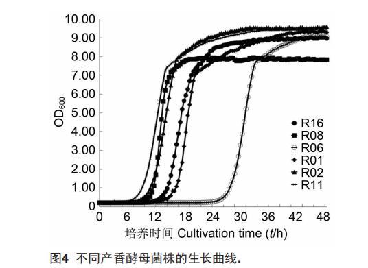 圖4 不同產(chǎn)香酵母菌株的生長(zhǎng)曲線。