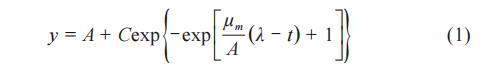 其中,A:細(xì)菌初始數(shù)量;C:細(xì)菌初始數(shù)量和最大數(shù)量之間的差值;μ_m:最大比生長率;λ:菌株生長滯后時(shí)間。將獲得的A值和培養(yǎng)時(shí)間的數(shù)據(jù)分別代入上述公式中的y和t,得到生長擬合曲線。