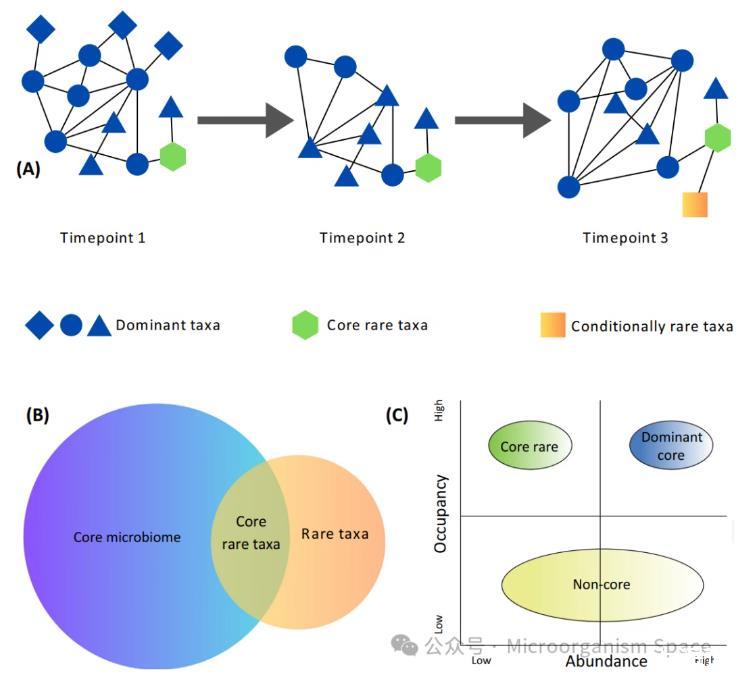 因此,研究稀有類群的時(shí)間動(dòng)態(tài)對(duì)于更好地理解稀有性至關(guān)重要。我們對(duì)它們的稀有模式有了更深入的理解。我們發(fā)現(xiàn),根據(jù)其時(shí)間動(dòng)態(tài),文獻(xiàn)中將稀有分類群分為兩大類:暫時(shí)稀有分類群和條件稀有分類群。暫時(shí)稀有分類群在微生物組中偶爾出現(xiàn)稀有狀態(tài),在其他時(shí)間點(diǎn)可能豐富也可能檢測(cè)不到。這可能是由于來(lái)自本地物種庫(kù)之外的微生物分類群的擴(kuò)散,它們?cè)谛颅h(huán)境中可能會(huì)暫時(shí)表現(xiàn)為稀有,然后繁榮(或消亡)。此外,條件稀有分類群的豐度可能會(huì)因有利的環(huán)境條件或核心微生物組成員的招募而周期性增加。核心微生物組,顧名思義,包括在給定環(huán)境條件下無(wú)論豐度如何都能在空間和時(shí)間上持續(xù)存在的微生物分類群及相關(guān)基因/功能。相比之下,稀有分類群的特點(diǎn)是在特定環(huán)境和時(shí)間點(diǎn)豐度較低。盡管這是一個(gè)新穎的想法,但可以設(shè)想存在第三類稀有分類群,它們處于核心微生物組和稀有分類群的交集處(圖1B),我們?cè)诖藢⑵浞Q為“核心稀有分類群”,這一概念將在下文進(jìn)行定義和討論。
