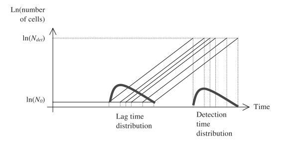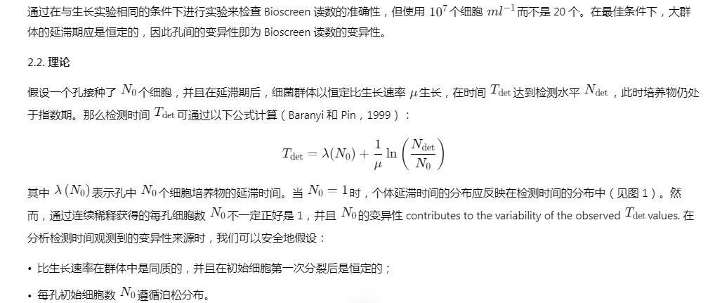 單個(gè)細(xì)胞的延滯時(shí)間與群體延滯期之間的聯(lián)系并不直接。Baranyi(1998,2002)和Baranyi和Pin(2001)分析了這一點(diǎn),并推導(dǎo)出一個(gè)數(shù)學(xué)公式,將個(gè)體延滯時(shí)間的分布與整個(gè)群體的延滯期聯(lián)系起來(lái)。該公式意味著,個(gè)體延滯時(shí)間的平均值可能遠(yuǎn)長(zhǎng)于群體水平觀測(cè)到的延滯期,盡管個(gè)體生理狀態(tài)參數(shù)的平均值與群體的生理狀態(tài)參數(shù)相同。此外,從延滯期到指數(shù)期的過(guò)渡曲線可以通過(guò)個(gè)體延滯時(shí)間分布的變換獲得,但就當(dāng)前可用數(shù)據(jù)的精度而言,從群體生長(zhǎng)曲線推斷個(gè)體延滯時(shí)間的分布是不可能的。因此,使用傳統(tǒng)活菌計(jì)數(shù)無(wú)法研究單個(gè)細(xì)胞的延滯時(shí)間。自動(dòng)化濁度測(cè)量可能提供解決方案,因?yàn)樗鼈冞m合產(chǎn)生大量重復(fù)檢測(cè)時(shí)間測(cè)量數(shù)據(jù)。如果每個(gè)觀測(cè)培養(yǎng)物從一個(gè)單細(xì)胞開始,那么檢測(cè)時(shí)間的分布應(yīng)接近初始單個(gè)細(xì)胞延滯時(shí)間的分布,假設(shè)由單細(xì)胞產(chǎn)生的每個(gè)群體的比生長(zhǎng)速率相同且恒定。