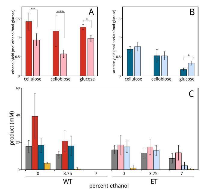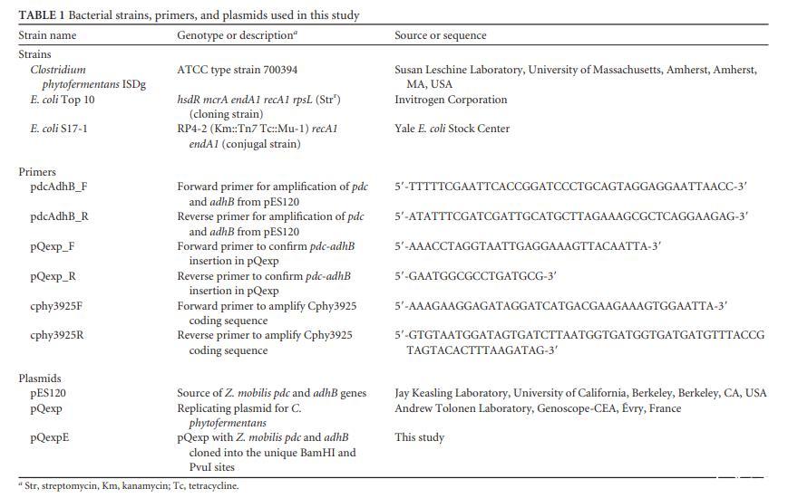 C. phytofermentans乙醇耐受性(ET)菌株通過連續(xù)傳代(1:50稀釋)到含有10 ml補(bǔ)充了遞增乙醇濃度的GS2培養(yǎng)基的培養(yǎng)管中進(jìn)行篩選。從在4%(體積/體積)(31.5 g liter-1)乙醇中的培養(yǎng)物開始,每周傳代到含有相同乙醇濃度和乙醇濃度高1%的新鮮培養(yǎng)基中。如果在較高濃度下1周后未觀察到生長,則培養(yǎng)物重新傳代到相同的乙醇濃度。如果培養(yǎng)物在較高乙醇濃度下生長,則該培養(yǎng)物再次傳代到該乙醇濃度和高1%的乙醇濃度。在7次每周傳代后觀察到在5%乙醇中生長,13次傳代后在6%乙醇中生長,19次傳代后在7%乙醇中生長。每次乙醇耐受性提高時(shí),將細(xì)胞鋪板,挑取單個(gè)菌落,并重新接種液體培養(yǎng)物,以確保選擇是基于一株具有提高的乙醇耐受性的特定菌株,而不是基于一個(gè)共同在提高的乙醇濃度下存活的菌株聯(lián)盟。因此,ET菌株是從在補(bǔ)充了7%(體積/體積)乙醇的GS2培養(yǎng)基中生長的母培養(yǎng)物中通過菌落純化分離得到的。經(jīng)菌落純化后,確認(rèn)ET菌株具有與母培養(yǎng)物相似的乙醇抗性。