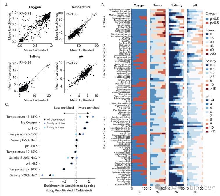 未培養(yǎng)微生物的新發(fā)現(xiàn):預(yù)測(cè)顯示,未培養(yǎng)物種更傾向極端環(huán)境(如高溫厭氧、高酸),暗示實(shí)驗(yàn)室培養(yǎng)條件的設(shè)計(jì)需突破常規(guī)思路。