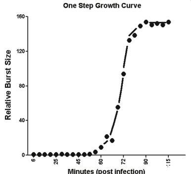 通過(guò)一步生長(zhǎng)實(shí)驗(yàn)確定所選噬菌體的裂解量(平均每個(gè)感染細(xì)胞釋放的噬菌體數(shù)量)和潛伏期(從感染到子代噬菌體開(kāi)始釋放的時(shí)間),該方法參考了的描述并略有修改。