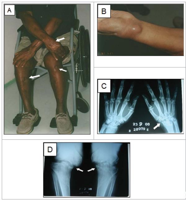 一名61歲的退休砌磚工,患有糖尿病和高血壓,因6年皮膚病變病史被轉(zhuǎn)診至里約熱內(nèi)盧Evandro Chagas國(guó)家傳染病研究所傳染病皮膚病學(xué)實(shí)驗(yàn)室。初步診斷后,他接受了5個(gè)月的碘化鉀治療,皮膚病變愈合。然而,他主訴膝蓋和左腕關(guān)節(jié)疼痛逐漸加重,至轉(zhuǎn)診至INI前兩年需坐輪椅。轉(zhuǎn)診至INI前6個(gè)月,他注意到皮膚病變復(fù)發(fā)。