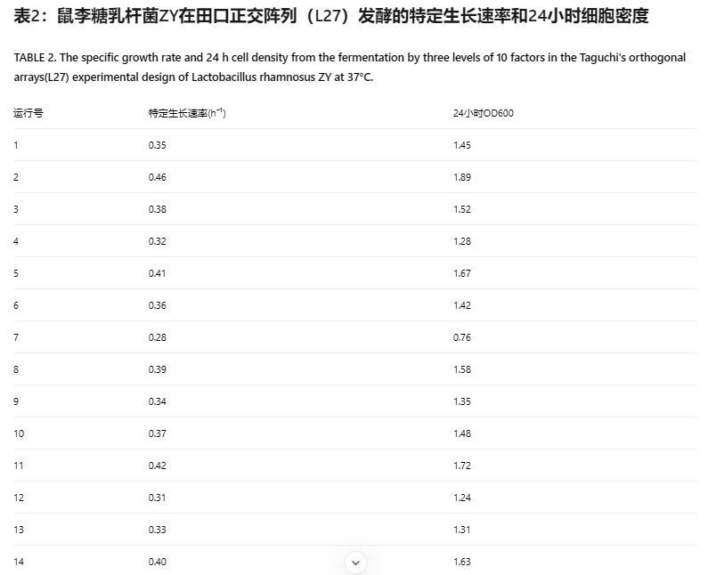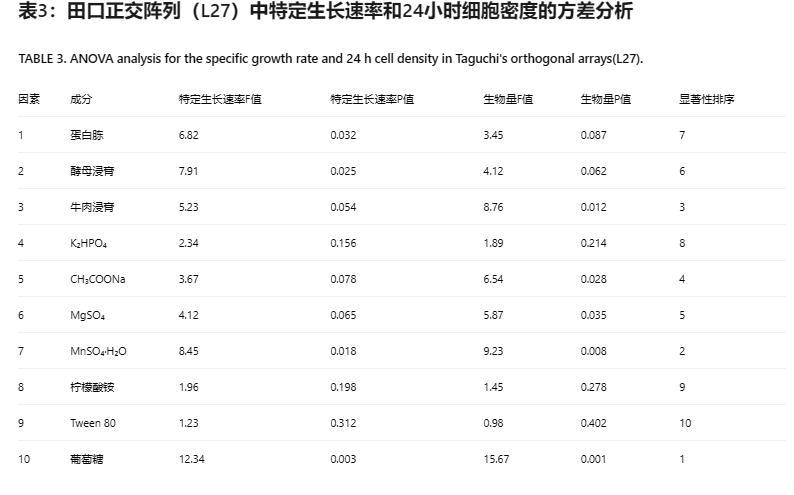 表1所示的正交實驗設計(L27)包括10種成分的三個水平MRS,用于評估培養(yǎng)基效果。24小時生物量的OD600變化范圍從0.76到1.89,分別對應運行7和運行2(表2)。