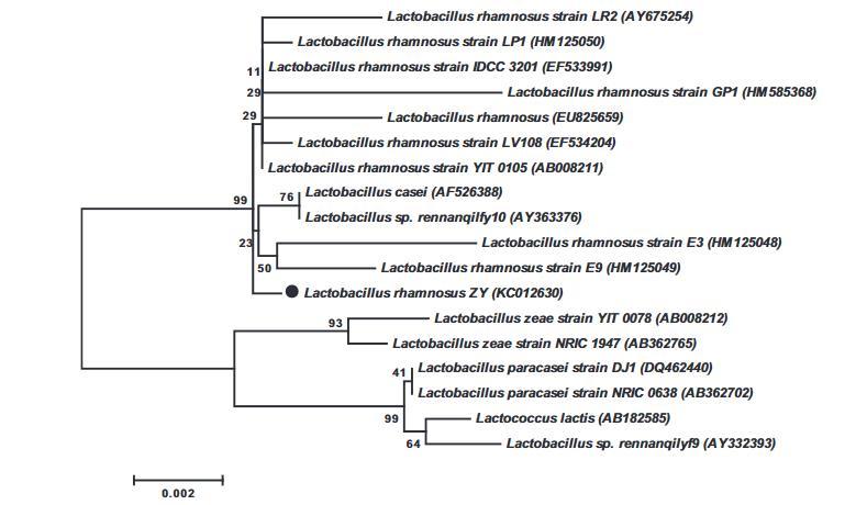分離菌株ZY為桿狀、革蘭氏陽性,具有白色光滑菌落,并在靜態(tài)條件下燒瓶發(fā)酵期間具有產(chǎn)生乳酸的能力?;谶@些結果,該菌株被鑒定為乳酸菌。16S rRNA序列表明分離菌株與鼠李糖乳桿菌密切相關?;谧钕嚓P物種16S rRNA序列的系統(tǒng)發(fā)育樹分析(圖1),該菌株被鑒定并命名為鼠李糖乳桿菌ZY(登錄號KC012630)。該新菌株與鼠李糖乳桿菌LR2(登錄號AY675254)相似度為99.1%,與玉米乳桿菌NRIC1947(登錄號AB362765)相似度為97%,與副干酪乳桿菌NRIC0638(登錄號AB362702)相似度為96.7%。