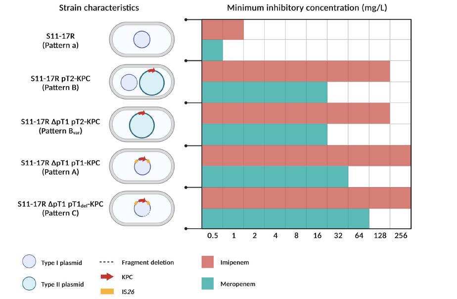 產(chǎn)肺炎碳青霉烯酶的銅綠假單胞菌(KPC-PA)分離株在中國(guó)迅速擴(kuò)增,尤其是高??寺T463。旨在探索推動(dòng)ST463克隆成功的KPC相關(guān)質(zhì)粒的進(jìn)化。本研究對(duì)2011—2020年收集的1258株臨床銅綠假單胞菌菌株進(jìn)行全基因組測(cè)序,識(shí)別出106株ST463-PA菌株,其中KPC的檢出率為90.6%。研究發(fā)現(xiàn)在早期(2011—2012年),ST463-PA獲得了編碼KPC的II型(pT2-KPC)或I型質(zhì)粒(pT1-KPC)以克服碳青霉烯類(lèi)抗生素的壓力。2012—2017年間,由于pT1-KPC質(zhì)粒具有較低的適應(yīng)性成本和IS26驅(qū)動(dòng)的blaKPC擴(kuò)增能力,其成為主導(dǎo)質(zhì)粒。到2017—2020年,pT1-KPC質(zhì)粒發(fā)生大片段缺失,形成了pT1del-KPC質(zhì)粒。該質(zhì)粒具有更低的適應(yīng)性成本、增強(qiáng)的blaKPC-2基因穩(wěn)定性和更大的拷貝數(shù)靈活性,同時(shí)保持了水平傳播能力。因此pT1del-KPC質(zhì)粒最終取得成功,使ST463成為中國(guó)的主要ST。研究還評(píng)估了不同質(zhì)粒模式在ST463遺傳背景下的適應(yīng)性成本,并發(fā)現(xiàn)攜帶pT1del-KPC質(zhì)粒的菌株在無(wú)抗生素或高濃度美羅培南條件下比攜帶pT1-KPC質(zhì)粒的菌株具有更高的適應(yīng)性。在低濃度美羅培南壓力下,pT1del-KPC質(zhì)粒通過(guò)增加質(zhì)粒拷貝數(shù)來(lái)放大blaKPC-2基因,而pT1-KPC質(zhì)粒則通過(guò)IS26介導(dǎo)的blaKPC-2基因擴(kuò)增來(lái)響應(yīng)。這些發(fā)現(xiàn)強(qiáng)調(diào)了進(jìn)化壓力推動(dòng)ST463優(yōu)勢(shì)的形成,并強(qiáng)調(diào)了需要有針對(duì)性的策略來(lái)控制其傳播和抗生素抗性的發(fā)展。