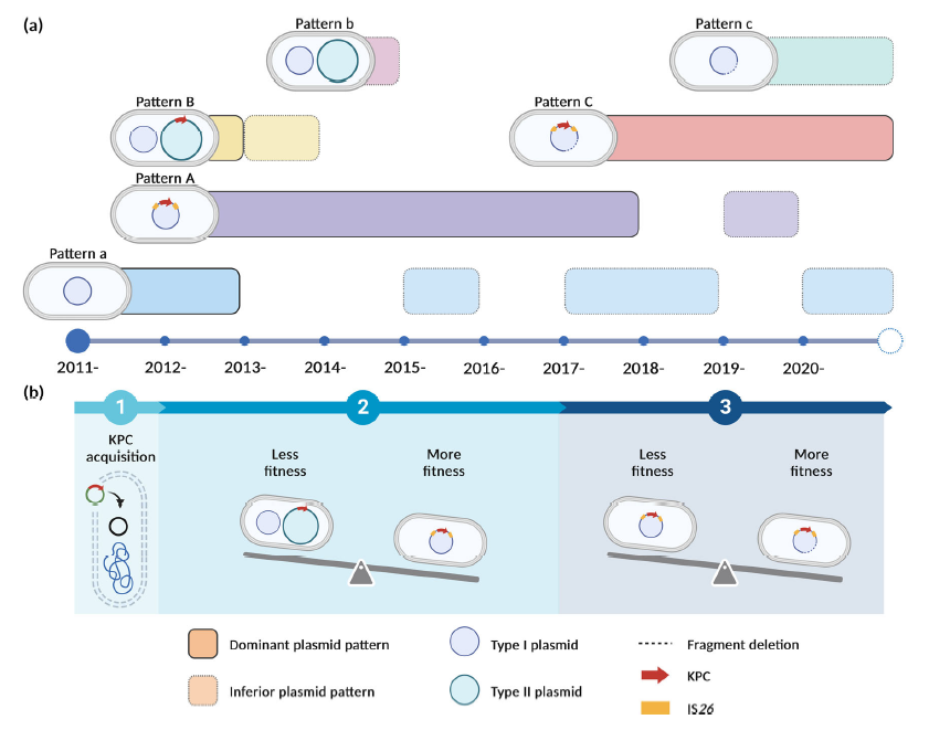 圖2、ST463-PA分離株中KPC相關(guān)質(zhì)粒的進(jìn)化過(guò)程。a在研究中,來(lái)自ST463-PA分離株的不同KPC相關(guān)質(zhì)粒模式的時(shí)間分布。每年的顯性和從屬質(zhì)粒模式分別以實(shí)線的不透明色和虛線的透明色為標(biāo)志。b關(guān)于ST463-PA分離株中KPC相關(guān)質(zhì)粒多階段進(jìn)化軌跡的提案。