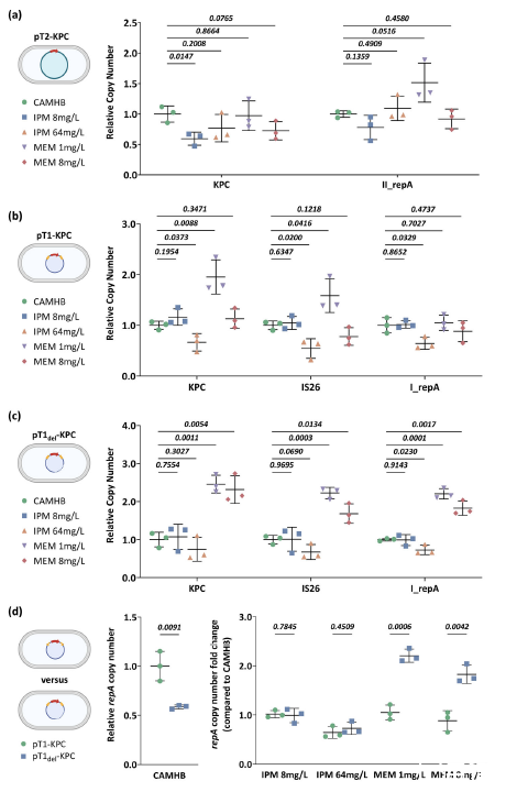 圖5、不同碳青霉烯類(lèi)壓力下的基因拷貝數(shù)變化。a-c)pT2-KPC、pT1-KPC和pT1del-KPC質(zhì)粒的基因拷貝數(shù)。d)pT1-KPC和pT1 del-KPC質(zhì)粒之間的比較。面板中的每個(gè)數(shù)據(jù)點(diǎn)對(duì)應(yīng)于從三個(gè)技術(shù)重復(fù)(n=3個(gè)生物獨(dú)立樣本)計(jì)算出的一個(gè)生物重復(fù)。