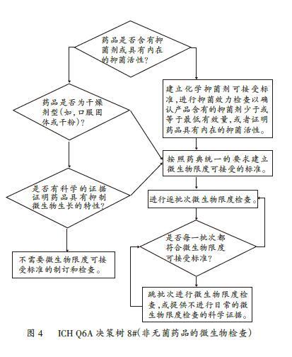 由于非水性液體制劑或固體藥劑為低aw,不支持孢子萌發(fā)和微生物生長,其微生物監(jiān)控頻率決定于產(chǎn)品的歷史測(cè)試數(shù)據(jù)和原料、水、生產(chǎn)過程的微生物污染控制的有效性證明。在科學(xué)的微生物風(fēng)險(xiǎn)評(píng)估基礎(chǔ)上,采用aw測(cè)定進(jìn)行微生物監(jiān)控,建立合理的微生物控制策略、設(shè)計(jì)性能優(yōu)良的藥品對(duì)于節(jié)約成本、提高效率、提升產(chǎn)品質(zhì)量具有重要指導(dǎo)意義。國際人用藥品標(biāo)準(zhǔn)協(xié)調(diào)組織(ICH)Q6A的決策樹6#原料藥和輔料的微生物檢查(圖3)和8#非無菌藥品的微生物檢查(圖4),是低aw的非無菌原料藥和輔料及非無菌制劑可不進(jìn)行批批微生物限度檢查的重要技術(shù)指導(dǎo)原則。我國于2017年正式加入ICH,意味著中國的藥品監(jiān)管部門、制藥行業(yè)和研發(fā)機(jī)構(gòu)將逐步轉(zhuǎn)化和實(shí)施國際科學(xué)技術(shù)標(biāo)準(zhǔn)和指南,并積極參與規(guī)則制訂,將推動(dòng)國際創(chuàng)新藥品早日進(jìn)入中國市場,滿足臨床用藥需求,同時(shí)提升國內(nèi)制藥產(chǎn)業(yè)創(chuàng)新能力和國際競爭力。