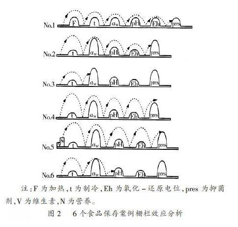 通過柵欄技術(shù)使食品本身具有一定的抑菌能力,可以使食品的微生物特性穩(wěn)定,使得儲(chǔ)藏的食品更安全。柵欄技術(shù)應(yīng)用于食品保存的6個(gè)案例(圖2)可幫助理解aw對(duì)于微生物生長的重要意義。柵欄因子的組合將增加不利于食品中潛在微生物的生長,并增加微生物生長的滯后期,如果微生物的生存環(huán)境持續(xù)抑制其生長繁殖,滯后期無限延長,將致使微生物死亡。