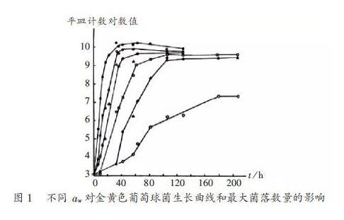 許多微生物通過細(xì)胞調(diào)節(jié)可在低aw條件下存活,但不能生長。隨著aw的降低將導(dǎo)致微生物生長停滯期的延長,生長速率減慢和菌落數(shù)量減少,圖1顯示了不同aw對(duì)金黃色葡萄球菌生長曲線和最大菌落數(shù)量的影響。產(chǎn)品中細(xì)菌、酵母菌和霉菌的萌發(fā)、新陳代謝、繁殖和生存需要可利用水,基于這樣的規(guī)律,可利用aw這一重要參數(shù)預(yù)測(cè)產(chǎn)品中潛在微生物生長繁殖的能力和潛在的安全風(fēng)險(xiǎn)。