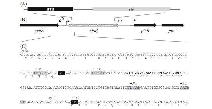 包含claR基因的DNA區(qū)域的結(jié)構(gòu)特征 圖1描繪了來自乳酸乳球菌IL1403的claR基因(原yebF)的染色體區(qū)域。ClaR顯示出與RpiR家族轉(zhuǎn)錄調(diào)控因子的高度序列相似性:它是一種雙結(jié)構(gòu)域蛋白,具有67個(gè)殘基的N端DNA結(jié)合螺旋-轉(zhuǎn)角-螺旋(HTH)基序和123個(gè)殘基的C端糖異構(gòu)酶(SIS)結(jié)構(gòu)域(圖1a;http://pfam.sanger.ac.uk/)。