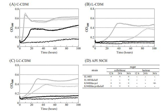 claR缺失突變體的表型 在我們先前的研究中,利用pGhost9::ISS1對發(fā)酵乳糖的ccpA突變體進(jìn)行隨機(jī)誘變。通過此程序,在補(bǔ)充有X-Gal的平板上,我們分離了幾個(gè)在ccpA突變體背景中具有β-半乳糖苷酶陰性表型的突變體。其中,在ccpA突變體中claR(yebF)的失活導(dǎo)致其喪失乳酸發(fā)酵能力。因此,在本研究中,在IL1403野生型菌株和IL1403△ccpA中均進(jìn)行了claR的缺失,分別產(chǎn)生IL1403△claR和IL1403△ccpA△claR突變體。隨后,測試了IL1403△claR和IL1403△ccpA△claR在補(bǔ)充有各種糖的CDM中的生長,并與它們各自的親本菌株進(jìn)行了比較。在C-CDM中,IL1403△claR突變體最初顯示無生長能力,并且在長時(shí)間培養(yǎng)后觀察到細(xì)胞光密度的微小增加(圖2a)。在IL1403△claR菌株中缺失ccpA導(dǎo)致所得IL1403△ccpA△claR菌株在C-CDM中的生長部分恢復(fù)(圖2a)。與它們的親本IL1403和IL1403△ccpA菌株相比,IL1403△claR和IL1403△ccpA△claR在L-CDM中均無生長(圖2b)。向該培養(yǎng)基中添加誘導(dǎo)濃度的纖維二糖(LC-CDM)并未恢復(fù)突變體的生長(圖2c)。在IL1403和IL1403△ccpA菌株中缺失claR基因?qū)ν蛔凅w在含熊果苷、七葉苷、半乳糖、葡萄糖或水楊苷的培養(yǎng)基中的生長沒有影響(數(shù)據(jù)未顯示)。