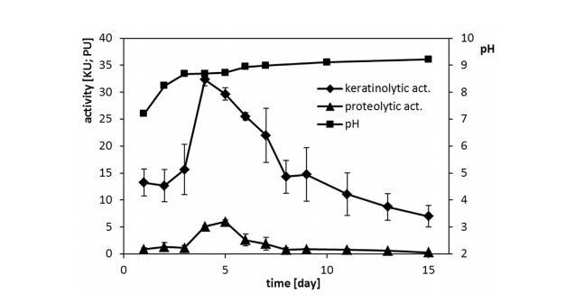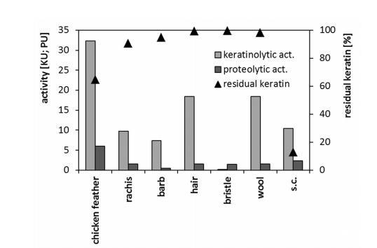 藤黃微球菌B1pz菌株除了能夠有效分解雞羽毛底物外,還能在各種角蛋白材料存在下生長(zhǎng)和生產(chǎn)角蛋白酶。在人發(fā)或羔羊毛上培養(yǎng)物中觀察到的最大角蛋白分解活性水平,與雞羽毛培養(yǎng)基相比降低了約50%(圖4)。分離的鴕鳥羽毛羽軸和羽枝被證明是效果差得多的角蛋白酶誘導(dǎo)物,而在含有豬鬃的培養(yǎng)基中未檢測(cè)到角蛋白酶活性。測(cè)試的菌株在雞羽毛上生長(zhǎng)時(shí)優(yōu)先產(chǎn)生角蛋白分解酶,而不是在其他高彈性的"硬角蛋白"上,這也反映了在短短4天培養(yǎng)期內(nèi)底物分解程度達(dá)到35.3%。表皮角質(zhì)層作為富含細(xì)胞角蛋白的"軟"角蛋白的例子,盡管對(duì)細(xì)菌生物降解具有高度敏感性,但對(duì)測(cè)試菌株來說仍然是一個(gè)中等強(qiáng)度的角蛋白酶誘導(dǎo)物。