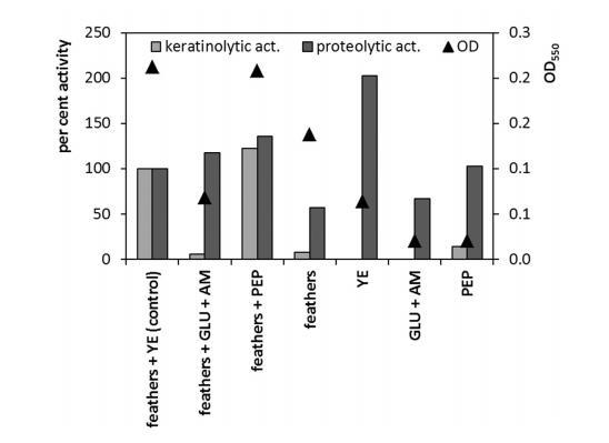 盡管如此,在2%羽毛含量時(shí),酪蛋白分解蛋白酶的生產(chǎn)出現(xiàn)輕微刺激。向羽毛培養(yǎng)基中添加額外的補(bǔ)充劑也是角蛋白酶生產(chǎn)的關(guān)鍵因素。與含有羽毛和酵母提取物的對(duì)照培養(yǎng)基相比,添加蛋白胨導(dǎo)致最大角蛋白分解活性刺激了22%(圖3)。葡萄糖幾乎完全抑制了角蛋白酶的生產(chǎn),但不影響蛋白水解活性。羽毛誘導(dǎo)物的存在對(duì)角蛋白酶的生物合成至關(guān)重要,但對(duì)酪蛋白分解蛋白酶則不然。然而,測(cè)試菌株在羽毛培養(yǎng)基中沒有任何補(bǔ)充劑的情況下無法產(chǎn)生顯著的角蛋白酶水平。