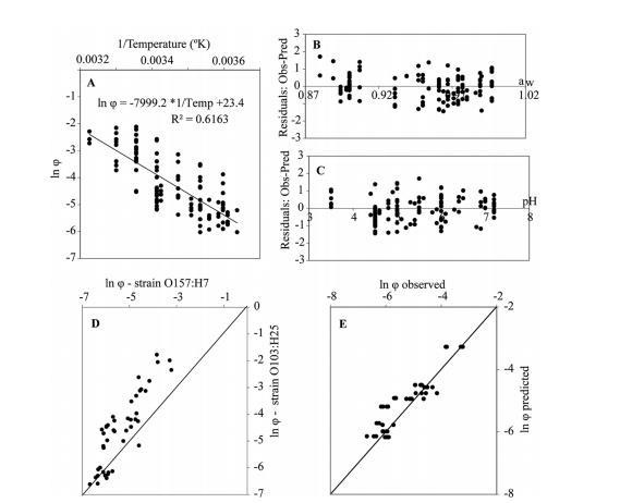 為研究未解離乳酸濃度對(duì)大腸桿菌非熱滅活的影響,我們生成了一套新的數(shù)據(jù)集,包含96條存活曲線,涉及兩種大腸桿菌血清型(O157:H7和O103:H25),在多種乳酸濃度、溫度、pH和a_w組合下進(jìn)行。這兩種血清型滅活速率的比較表明,大腸桿菌O103:H25的衰減速率顯著高于O157:H7(P值<0.0001)。大腸桿菌O157:H7表現(xiàn)出更強(qiáng)的抗滅活能力,尤其是在低pH條件下。初始的非熱滅活模型在最苛刻條件下預(yù)測(cè)的滅活速率快于該菌株的實(shí)際觀測(cè)值。因此,我們對(duì)模型進(jìn)行了修正,使其能夠基于本研究中發(fā)現(xiàn)的抗性最強(qiáng)的菌株(O157:H7)來(lái)預(yù)測(cè)VTEC的存活情況。修正方法是在模型中引入一個(gè)因子F,該因子根據(jù)模型預(yù)測(cè)值與O157:H7實(shí)測(cè)滅活速率之間的偏差計(jì)算得出。利用該菌株生成的數(shù)據(jù)也用于通過(guò)乳酸影響項(xiàng)擴(kuò)展VTEC的非熱滅活模型。