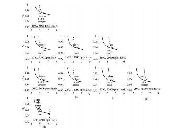 為探究模型在不同乳酸濃度、溫度、pH和a_w組合下的性能,本研究生成了一套新的數(shù)據(jù)集??傮w而言,包含乳酸影響項(xiàng)的擴(kuò)展模型預(yù)測(cè)結(jié)果與獨(dú)立生成的生長(zhǎng)/不生長(zhǎng)數(shù)據(jù)吻合良好。估計(jì)擴(kuò)展模型(含乳酸項(xiàng))的預(yù)測(cè)與觀測(cè)響應(yīng)之間的一致性百分比為86%,而原始模型(不含乳酸項(xiàng))的一致性為77%。