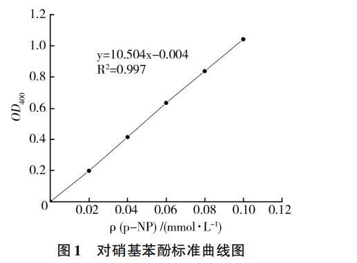 配制不同濃度p-NP溶液(0、0.02、0.04、0.06、0.08、0.10 mmol/L),在波長400 nm下測定其吸光度,結果見圖1。