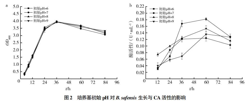 用5 mol/L NaOH溶液與1 mol/L HCl溶液調節(jié)液體培養(yǎng)基初始pH值分別至6.0、7.0、8.0、9.0。以2%(體積分數(shù),下同)的接種量將菌懸液(OD???=0.5)接至100 mL液體培養(yǎng)基中,置于30℃、150 r/min的恒溫搖床中培養(yǎng)。分別于4、8、12、24、36、60、84 h檢測菌液OD???,12、24、36、60、84 h檢測CA活性。每組實驗設3個平行樣,結果取平均值。