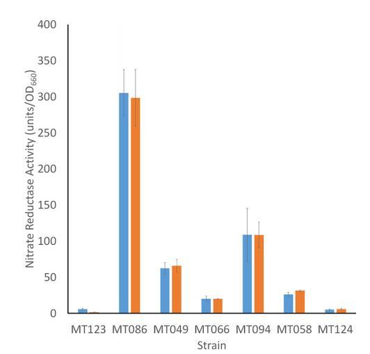 只有Castellaniella sp.菌株MT123,對(duì)COMM最敏感的菌株(表3),顯示顯著降低(從6.0±1.3到1.5±0.6單位/OD660)。MT123也是唯一有可檢測(cè)亞硝酸鹽還原酶活性的菌株。所有其他六種菌株缺乏可檢測(cè)亞硝酸鹽還原酶活性,表明這些菌株還原硝酸鹽并排泄生成的亞硝酸鹽。當(dāng)在無(wú)COMM下生長(zhǎng)時(shí),MT123的亞硝酸鹽還原酶活性為22.0±12.5單位/OD660,當(dāng)與金屬混合物生長(zhǎng)時(shí)為38.5±3.6單位/OD660。由于亞硝酸鹽生產(chǎn)用于測(cè)定硝酸鹽還原酶活性,MT123的亞硝酸鹽還原酶活性存在可能導(dǎo)致該菌株的硝酸鹽還原酶活性被低估。相反,除MT123外,圖3中顯示的ORR菌株的硝酸鹽還原活性可能真實(shí)反映它們還原硝酸鹽的能力,并且明顯菌株間存在巨大變異。更重要的是,這些largely不受高濃度多種金屬影響。