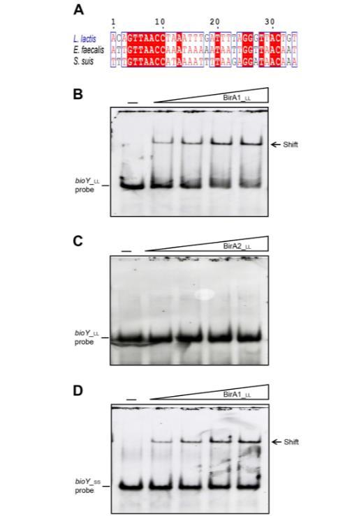 為了測(cè)試預(yù)測(cè)的BirA位點(diǎn)功能(圖8A和9A),進(jìn)行了電泳遷移率變動(dòng)分析(EMSA),使用純化的BirA1_LL和BirA2_LL(圖9B-D)。EMSA證實(shí)BirA1_LL以劑量依賴性方式有效結(jié)合bioY1探針(圖9B),而缺乏推定的N端DNA結(jié)合基序的BirA2_LL不結(jié)合探針(圖2和9C)。有趣的是,豬鏈球菌bioY(bioY_ss)啟動(dòng)子能夠與乳酸乳球菌BirA1_LL相互作用(圖9D)。在豬鏈球菌BirA的情況下也發(fā)現(xiàn)了類似情況,它也能結(jié)合乳酸乳球菌bioY啟動(dòng)子。因此,我們預(yù)期豬鏈球菌和乳酸乳球菌的bioY和BirA之間存在串?dāng)_。鑒于BirA1和bioY1啟動(dòng)子之間發(fā)生相互作用,而bioY2缺乏預(yù)測(cè)的BirA1結(jié)合位點(diǎn),探究這種調(diào)控機(jī)制與生物素同化的生理相關(guān)性可能很有意義。