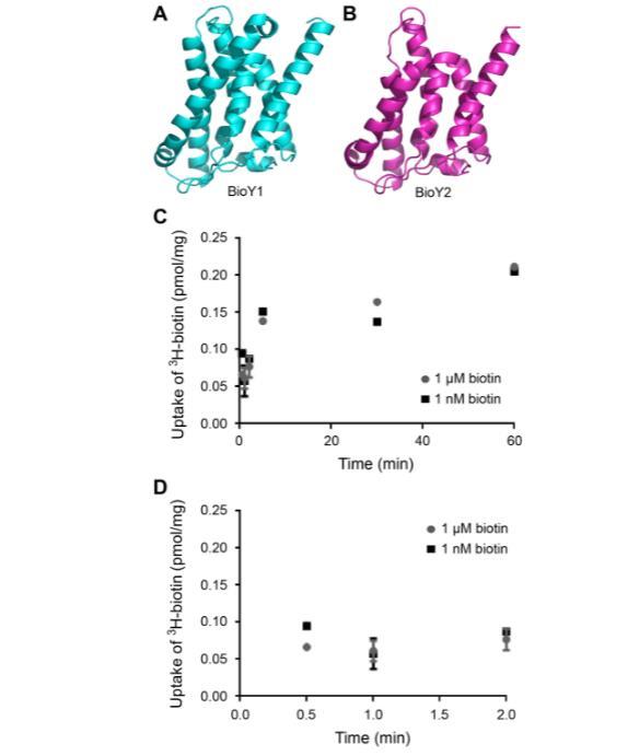 針對(duì)已解析的BioY結(jié)構(gòu)的結(jié)構(gòu)建模表明,BioY1_LL(圖10A)和BioY2_LL(圖10B)均由七個(gè)α-螺旋組成,并在整體構(gòu)型上表現(xiàn)出明顯相似性。鑒于乳酸乳球菌編碼兩個(gè)BioY轉(zhuǎn)運(yùn)蛋白,我們假設(shè)它能夠進(jìn)行強(qiáng)大的生物素轉(zhuǎn)運(yùn)。乳酸乳球菌培養(yǎng)物在限制生物素或過(guò)量生物素(1 nM或1μM)存在下生長(zhǎng)4.5小時(shí),離心沉淀并用PBS洗滌以去除游離生物素,用于3H-生物素轉(zhuǎn)運(yùn)測(cè)定(圖10C,D)。在測(cè)量時(shí)間間隔內(nèi),生物素耗竭培養(yǎng)物(預(yù)測(cè)產(chǎn)生兩種BioY轉(zhuǎn)運(yùn)蛋白)和生物素充足培養(yǎng)物(預(yù)測(cè)僅需單一轉(zhuǎn)運(yùn)蛋白)的3H-生物素相對(duì)轉(zhuǎn)運(yùn)相似。樣品之間的微小差異僅在初始轉(zhuǎn)運(yùn)時(shí)間點(diǎn)觀察到(圖10D)。相反,在一分鐘及以后,生物素的攝取/積累大致相等(圖10C)。似乎測(cè)試的外源生物素增量并未顯著增強(qiáng)生物素?cái)z取活性。